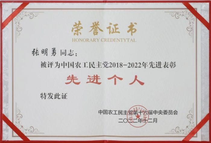 2022年12月3日,中国农工民主党2018-2022年先进集体和先进个人表彰大会召开。大会对543名先进个人,300个先进集体进行了表彰。山东省政协委员、我商会常务副会长、明日之星教育基金会发起人张明勇被农工党中央授予2018-2022年先进个人荣誉称号。