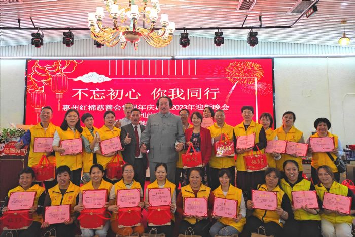 在3月学雷锋月里,惠州市红棉慈善会以“不忘初心,你我同行”为主题,举行15周年庆典活动,邀请了惠州市志愿服务联合会相关负责人,各级好人、道德模范代表,爱心企业家以及志愿者们欢聚一堂。晚上,志愿者们献上了精彩的自编节目,拍卖字画、酒水等爱心捐赠品,同时邀请优秀志愿者、好人代表上台分享公益心得。晚会表彰了惠州市红棉慈善会2022年度优秀志愿者和最美志愿者各15名,号召大家以雷锋为榜样,弘扬“奉献、友爱、互助、进步”的志愿服务精神,将学雷锋贯穿到日常生活的点点滴滴,传播文明,传递爱心。为致敬好人,惠州市红棉慈善会在晚会上举行礼遇好人环节,向古槐基等10个“中国好人”赠送慰问品。晚会还颁发爱心企业奖牌,向关心支持公益事业的爱心人士致谢。