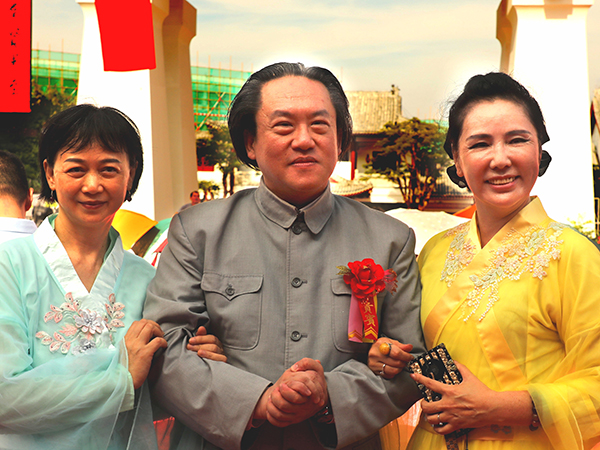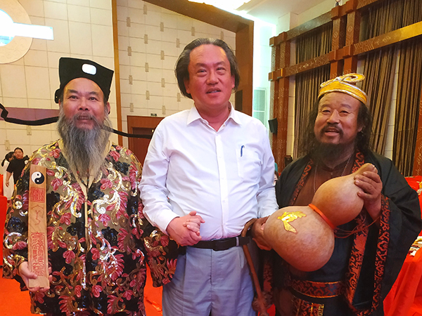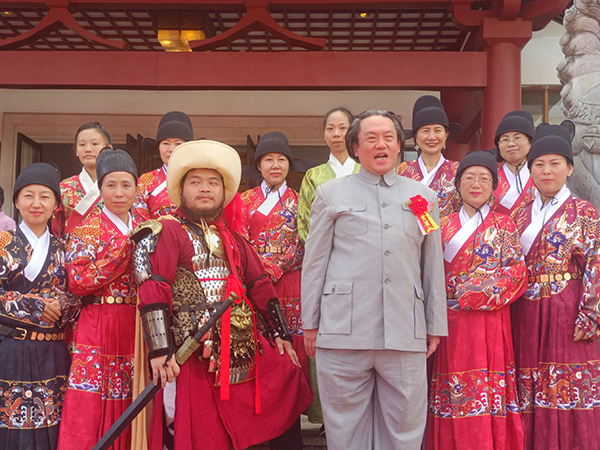 最后,大成文化汇演和大成宴圆满成功大家大合照,汪润田主席献花给儒学大师和一起高喊:继学师表、和谐世界。
