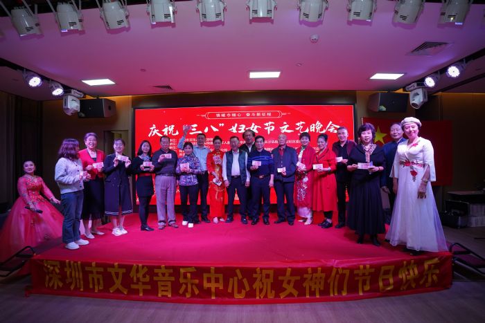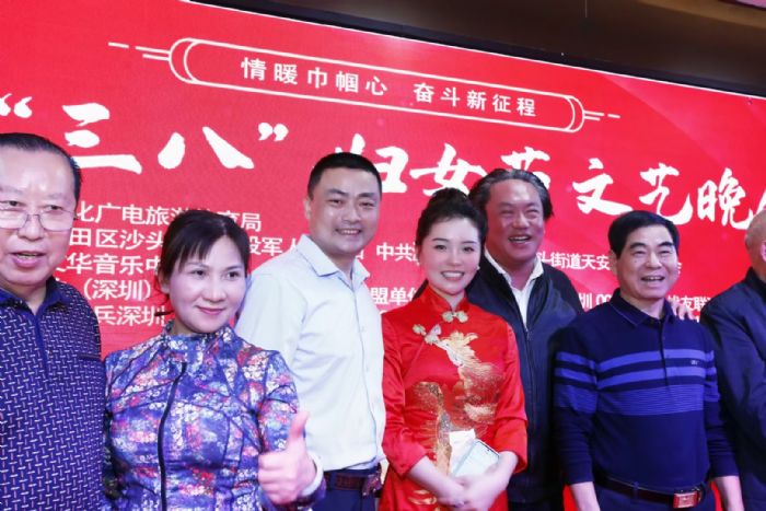 2024年3月8日晚,由深圳市文华音乐中心举办的庆祝“三八”妇女节文艺晚会在深圳市福田区深南道深南1号宴会大厅隆重举行。原深圳市福田区组织部周树凯部长,福田区沙头街道办天安社区黄鸿江书记,福田区沙头街道办天安社区郑梅副书记,福田区沙头街道退役军人服务站齐凯平副站长,福田区沙头街道办天安社区冯淑慧主任,深圳市明昇集团区城副总裁、大洋雅仕维传媒(深圳)有限公司董事长、深圳市文华音乐中心理事长刘代䘵先生,香港中华非物质文化遗产发展基金会(香港政府的慈善机构)终身副主席、香港《城市瞭望》杂志社社长,海峡两岸中国书画艺术交流协会会长、深圳市文华音乐中心高级顾问刘丽平女士,广东省山东商会(深圳)副会长、粤港爱心义工联盟主席、香港信用担保联合会主席、深圳市聚爱会荣誉会长、世界五邑商会荣誉主席、国际潮商联谊会文化主席、广东惠州红棉慈善会荣誉主席汪润田先生,深圳市文华音乐中心高级顾问何林先生、常务副理事长顾世增先生、深圳市斓海科技有限公司副总裁张淦荣先生等120余人应邀参与盛会。