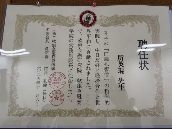 在此次考察交流期间,所英琨常务副会长被聘为联合国驻日本机构——一般财团法人国连支援财团副主席,日本软银金融研究院、软银金融商学院常务副院长。