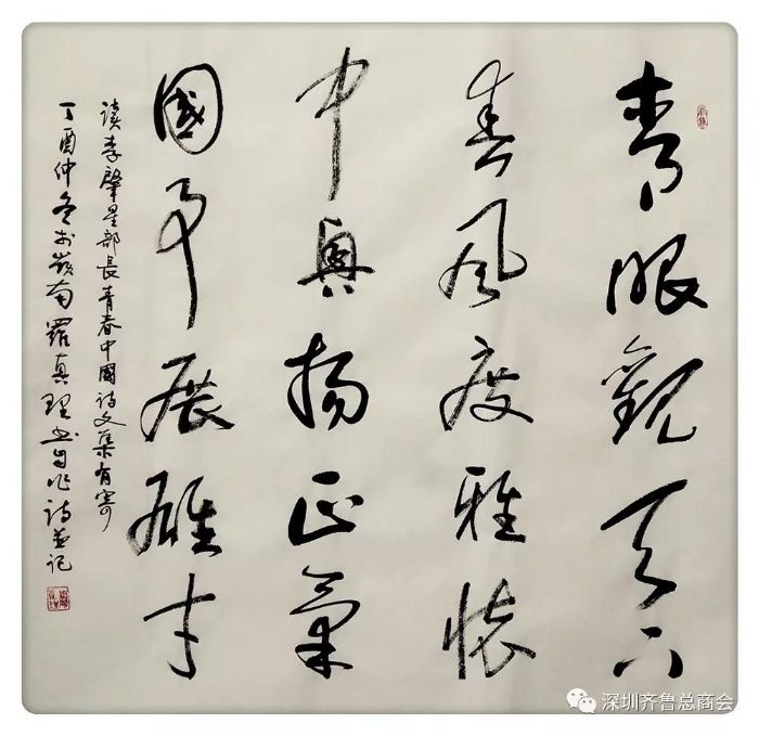 李肇星部长曾出版过一本诗歌散文集《青春中国》,他被大家誉为“外交诗人”,罗院长特意用书名《青春中国》四字即兴作了一首五言藏头诗,给李部长收藏的原创书法作品的内容写的就是这一首诗。