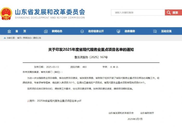 近日,山东省发展和改革委员会、山东省财政厅发布关于印发2025年度省现代服务业重点项目名单的通知。