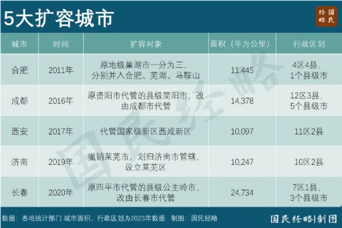 因此,自从合肥、成都、西安、济南、长春5大省会完成合并式扩张之后,最近5年时间,再也没有城市合并的案例,参阅《又一个千万人口大市,诞生》)。
