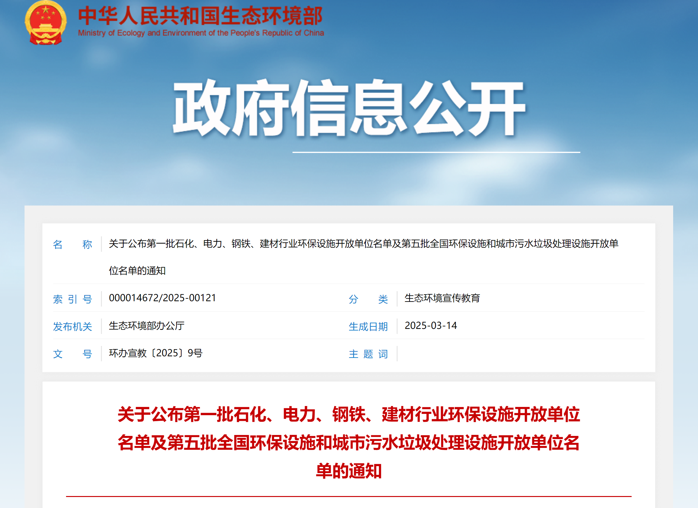 近日,生态环境部公布了两份开放单位名单: