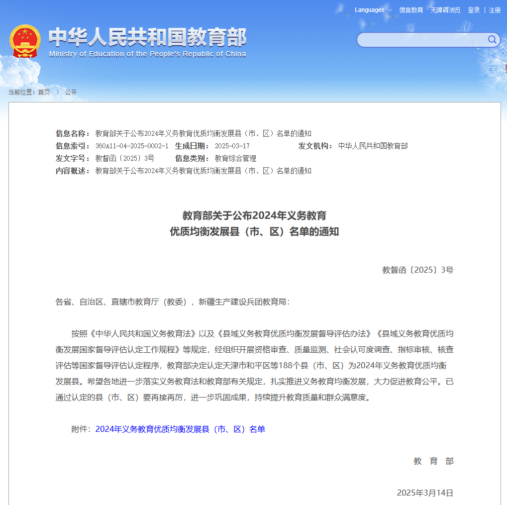 近日,教育部公布了2024年义务教育优质均衡发展县(市、区)名单,山东省31个县(市、区)上榜,数量居全国首位。