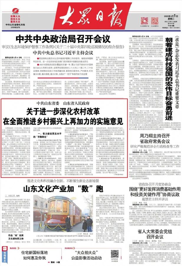4月1日,《中共山东省委 山东省人民政府关于进一步深化农村改革在全面推进乡村振兴上再加力的实施意见》,即2025年山东省委一号文件,正式向社会发布。